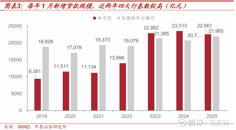 分银行类型来看,四大行基数较高,预计优质区域中小行更容易实现同比多增。根据2023年、2024年、2025年数据来看,四大行信贷投放前置明显,单月投放规模均超过2万亿元,远高于2019-2022年同期水平。在高基数情况下,2026年1月实现同比多增面临一定压力。相比之下,中小银行由于2025年基数相对偏低,且部分经济发达省份地区项目储备与经济景气度高,区域城农商行“开门红”表现可能更为积极,预计2026年初信贷投放有望同比多增。