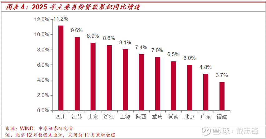 12月社融数据已出,2025 年全年累计新增社融同比+8.3%,增速较 11 月小幅下降 0.2 个点。信贷余额同比增长 6.4%,增速较上月持平;零售弱需求延续。区域分化特征持续,截至12月末,主要经济大省中,信贷增速保持在8%以上的省份为四川(11.2%)、江苏(9.6%)、山东(8.9%)、浙江(8.6%)、上海(8.1%)。