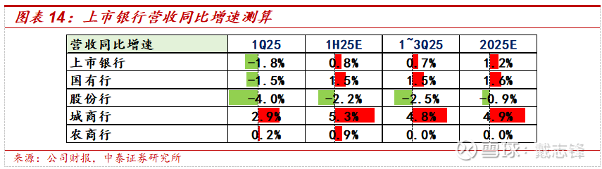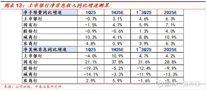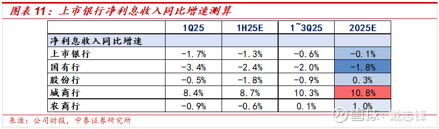 预计2025全年净利息收入同比-0.1%(3Q25同比-0.6%),降幅继续收窄。板块看,城商行延续高增,其他板块延续改善;测算上市银行中2025全年城商行、农商行、股份行、国有行累积净利息收入增速分别为+10.8%、+1%、+0.3%、-1.8%。