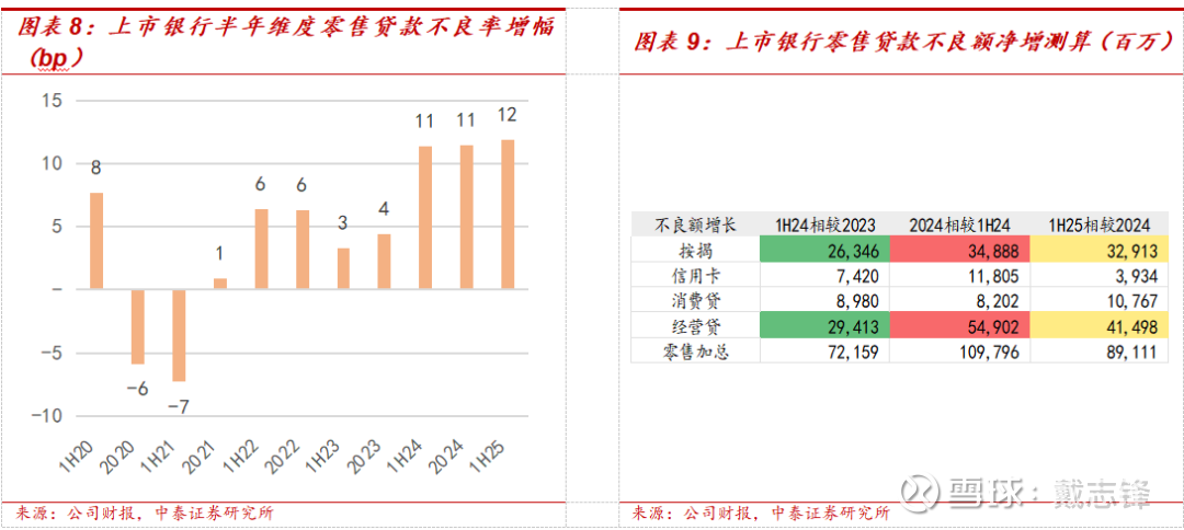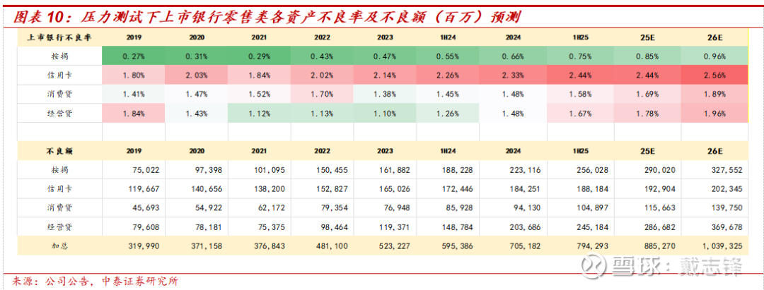 零售:根据我们在2026年1月8日外发报告《深度 | 银行四大零售资产的风险分析框架—按揭、信用卡、消费贷与经营贷》,预计25E、26E零售不良率难见拐点,中性预测下,25E按揭、经营贷、消费贷、信用卡不良率将分别较1H25提升10、11、11、0bp至0.85%、1.78%、1.69%、2.44%。