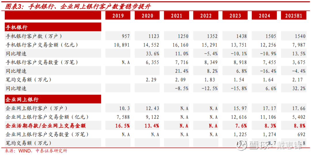 线上客户数量、交易规模持续提升,活期存款占比提高促进资金成本下行。1)零售客户方面,银行构建全天候在线金融服务通道,简化客户申贷流程、提高融资效率,优化移动端APP使用体验,助力推动手机银行客户规模、交易规模持续提升,1H25手机银行客户数量达到1540万户,交易金额、笔均交易金额分别同比增长13.5%、32.2%。2)公司客户方面,2025年上半年正式发布鸿蒙版企业手机银行,优化已有功能并推出新核心功能,强化对公电子银行服务能力。截至1H25银行企业网上银行客户数量创新高,为17.66万户,交易金额与交易笔数稳步提升。3)资金成本方面,从企业活期存款占企业网上银行客户交易金额比例来看,1H25为8.8%,较年初提升0.5个百分点,反映出“数字驱动”下的线上渠道发展有助于提高活期存款占比,降低资金成本。未来随着客户数据维度的进一步提升,单一客户价值也将逐渐凸显,为盈利带来增长空间。
