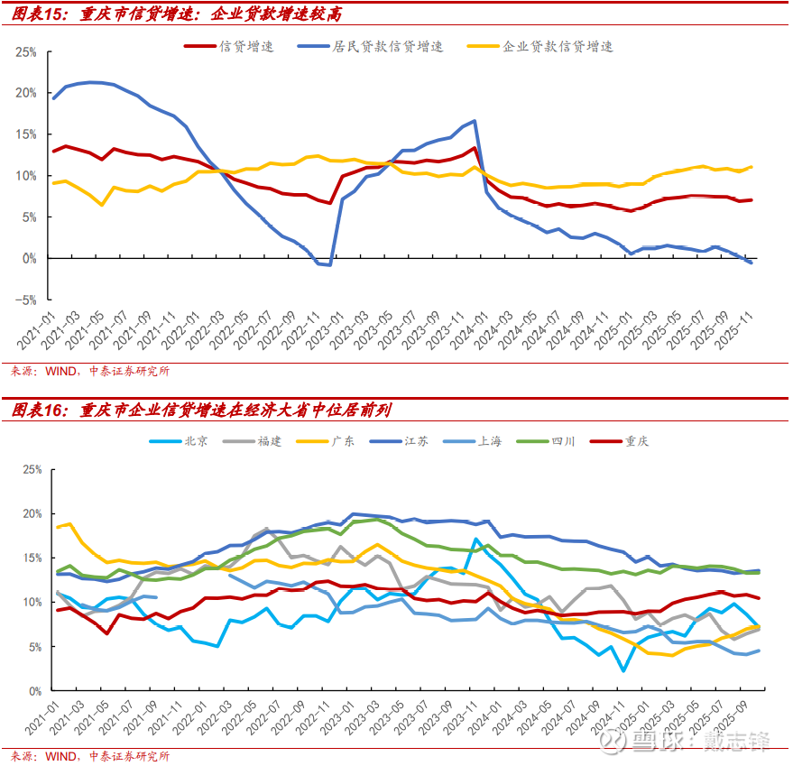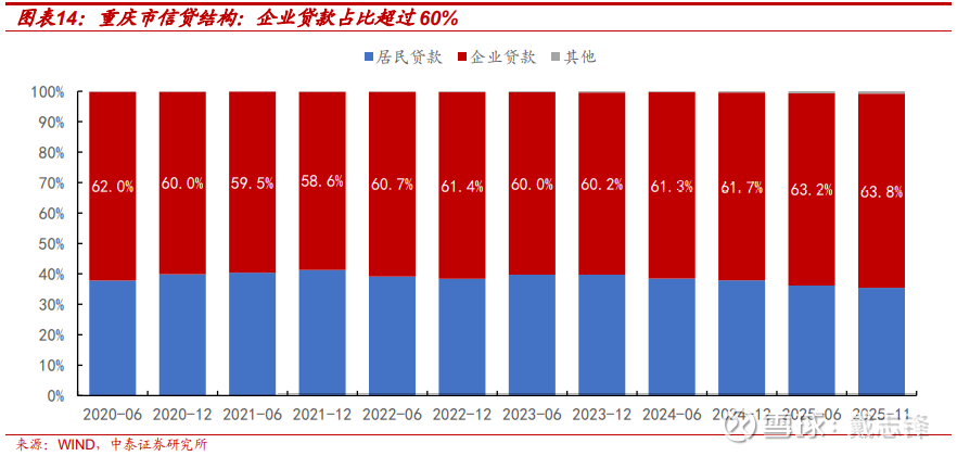 金融需求旺盛,信贷增速尤其是企业端增速较高。1)受益于重庆市基建、产业快速发展,为当地金融机构带来较为充足的企业端信贷需求,截至2025年11月,重庆市企业贷款占比总贷款比例为63.8%,较年初提升2.1个百分点。从增速来看,截至11月份重庆市信贷增速为7.0%,环比提升0.1个百分点,其中企业端、居民端分别同比增长11.0%、-0.5%,分别环比+0.5、-0.7个百分点。2)对比国内经济大省,截至10月份重庆市企业贷款增速仅低于江苏省、四川省,排名第三。因此较高的企业信贷增速成为当地银行业扩表的重要支撑因素。