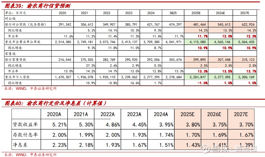 1)规模:①对公端:如前文所述,重庆市在双城经济圈、陆海新通道、33618产业体系建设等国家、地区战略推动下,企事业贷款增速将维持在较高水平,预计26年、27年增速将维持在11%附近。渝农商行持续深化服务制造业,2025年相关战略贡献银行近40%的对公贷款增量,预计在“三大新动能”推动下,银行市占率将小幅提升,预计25年与三季度末持平,26年、27年分别提升至12.0%、12.3%,对应对公贷款余额为4817、5456、6229亿元。②零售端:目前重庆市住户贷款增速疲软,25年全年同比下降1%,26年随着刺激消费政策落地及贷款利率下行,在乐观假设下,预计26年、27年全年住户贷款增速将维持小个位数增长。渝农商行在场景驱动等战略推动下,预计零售客户数量将有较大提升空间,带动零售贷款市占率维持上行态势,预计25年与三季度末持平,26年、27年分别提升至13.5%、13.7%,对应零售贷款规模为2999、3074、3151亿元。