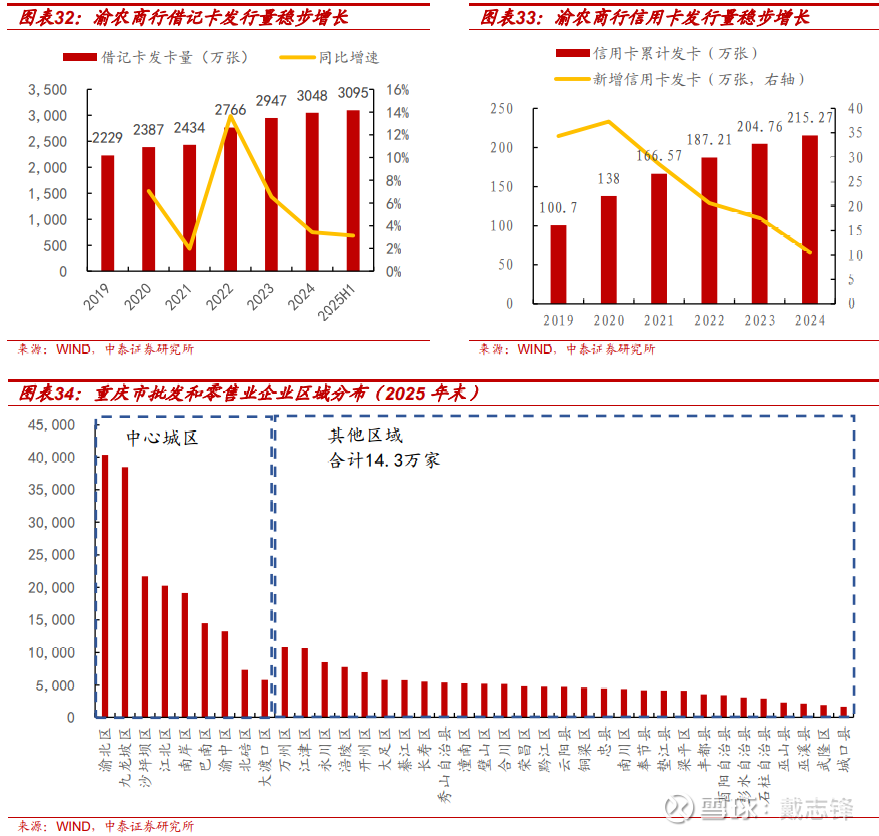 从县域客户分布来看:截至1H25银行累计在县域地区发放2444.3万张借记卡,占公司总发放量的78.97%,其中公司发放乡村振兴卡117.7万张,较上年末提升27.6%,较始发行的2021年增加114.5万张。同时,县域地区手机银行零售客户数量持续增长,截至1H25为1221.9万户,较上年末增加2.3%,占总手机银行客户数量比例为79.3%。除前文所述县域地区拥有6个市重点商圈外,还包含多个国际消费特色名街名镇名区及文化旅游项目,为消费构建多个场景。从重庆市批零业企业分布来看,截至2025年末县域地区共有14.3万家,占比达44.2%,因此更为下沉的县域客户可有效提升公司对县域地区商圈、场景的利用。