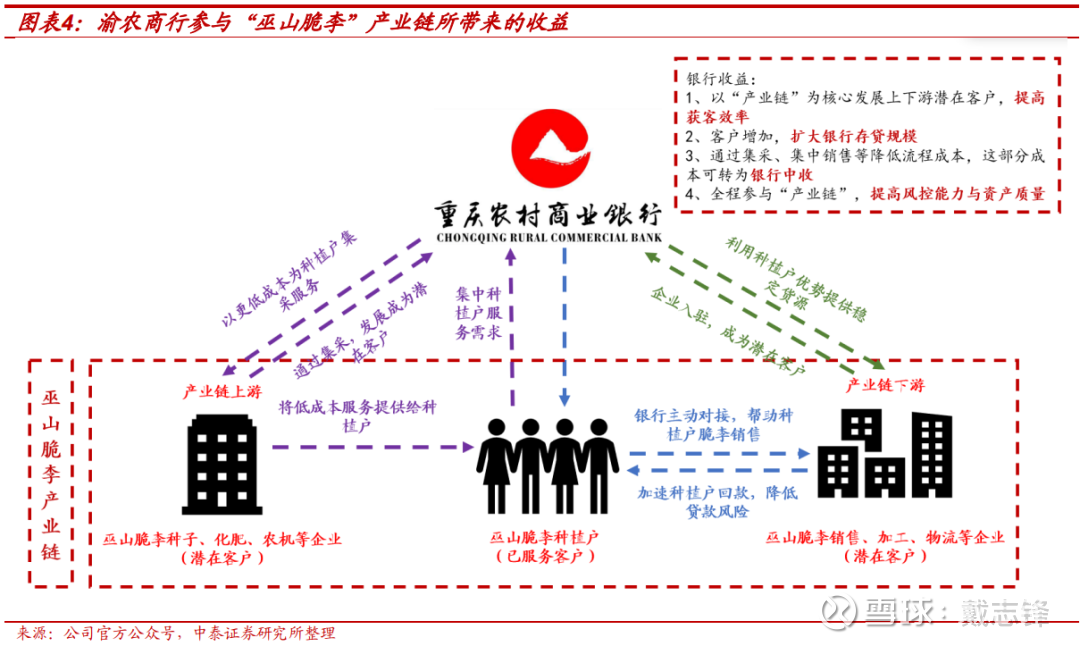以巫山脆李产业为例,探讨产业链动落地对银行报表的影响:1)提高获客效率、促进存贷扩张。银行在服务脆李种植户过程中,一方面可通过将其产品(脆李)集中销售的方式,与下游销售、加工、物流等企业进行接触,通过提供稳定活跃脆李货源将其发展成银行客户;另一方面通过集中脆李种植户需求,在其上游种子、化肥、农机等企业进行集中采购,通过合作的方式将其发展成银行客户。整体来看,提高了银行的获客效率,同时客户数量的提升也有助于银行存贷规模的扩张。2)促进提升银行中收收入。在脆李产业链中,银行一方面可在上游通过集采降低种植户成本,另一方面在下游通过提供量大且稳定的货源降低下游企业运营成本,一定程度提高银行中收收入。同时,跳出产业链外,银行通过对上下游企业进行服务可有效增加客户数量并提高其黏性,随着客户数据维度的增加,银行与其合作范围、产品营销也将有较大空间,为银行中收增长带来更大可能性。3)强化风控能力,提高资产质量。银行通过全流程参与“产业链”的运营,对上中下游客户有了更深的认识,同时通过对全流程的资金、产品、服务的参与,可更好的防范潜在风险,提高贷款质量。