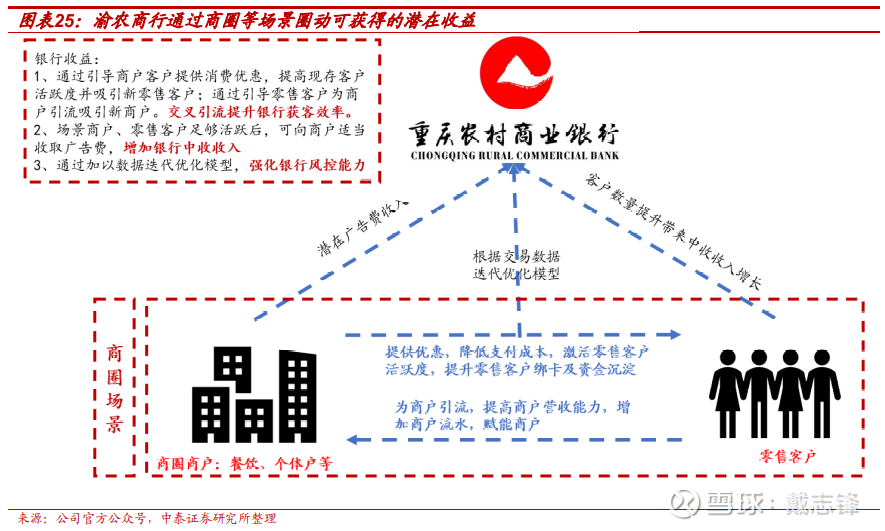 综上,场景圈动战略的落地可有效提升银行获客能力并提升潜在收益,而其开展的基础也主要分为两部分,一是外部需要有足够的类似“商圈”的场景供银行切入,而重庆市地广人多,重视“商圈”等商业场景建设,为银行战略落地提供场景基础;另一方面银行需要有足够的商户客户、零售客户数量来启动这种交叉引流,渝农商行深耕当地多年,客户数量已足够多,且网点市占率高,为战略落地提供内部优势;这两方面的优势可有效促进“场景圈动”战略的落地。