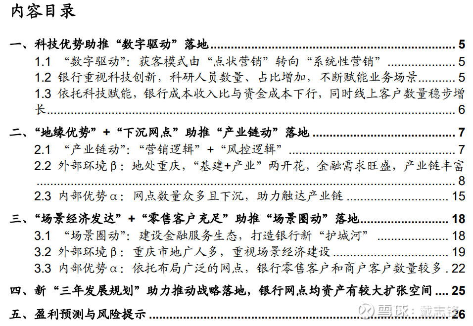 核心投资逻辑:“三大新动能”落地强化银行未来竞争能力:1)数字驱动:渝农商行重视科技创新并不断赋能业务场景,以“数字化”改革驱动获客模式由“点状营销”向“系统性营销”转变,将有提升银行营销、风控和贷后管理的质效,节约银行费用成本与资金成本。2)产业链动:外部来看重庆市基建、产业发达,产业链丰富且融资需求较强,内部来看银行网点众多且下沉,能更好切入产业链企业推动战略落地,打造“营销逻辑”与“风控逻辑”,助力银行扩表同时增强其创收能力。3)场景圈动:外部来看重庆市地广人多,重视商圈等场景业务发展,对内来看银行零售客户、商户数量较多,在当地金融机构占比较大,利好打造银行展业新的“护城河”,交叉引流提高银行获客效率并带来较大潜在收益。