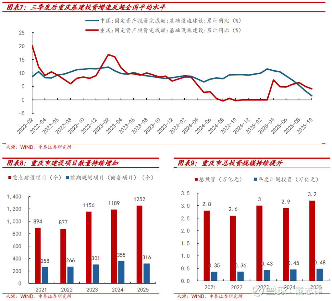 基建投资增速反超全国水平,项目建设数量、投资额持续提升。2025年三季度以来,重庆市基础设施建设投资完成额累计同比增速反超全国平均水平,截至10月份为4.1%,超出全国平均水平2.59个百分点。从重庆市重点项目实施情况来看,2025年重点建设项目为1252个,创2021年以来最高水平,储备项目数量为316个,仅次于2024年。从投资额来看,2025年项目总投资额为3.2万亿元,当年计划投资规模为0.48万亿元,均为2021年后最高水平,过往基建为当地金融机构扩表注入较强动能。
