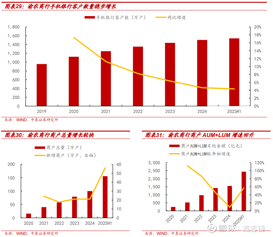 较多的营业网点为银行带来更稳健的客户增长。如前文所述,依托分布较广的营业网点,银行在客户开拓方面具有明显优势,零售客户规模稳步增长。1)手机银行客户:银行一方面通过线下网点进行推广与对接,另一方面则通过发布升级“免登录付款码”、“一键申贷”等手机银行功能,实现客户规模的稳步增长,截至1H25银行手机银行客户数量为1540.4万户,同比增长4.3%,2019年以来年化复合增速达9.0%。2)商户客户:早在新零售“五心”战略中,银行便提出从“B2C”向“BBC”转变,增加商户这一类重要客户,之后银行通过不断优化社区生态场景建设等举措,实现商户客户规模的快速增长,截至1H25商户总量达155.87万户,2020年以来复合增速达65.9%,实现从无到有的跨越。同时,2025年银行商户业务资管规模显著提升,日均AUM+LUM较2024年提升57.1%至2437.3亿元。