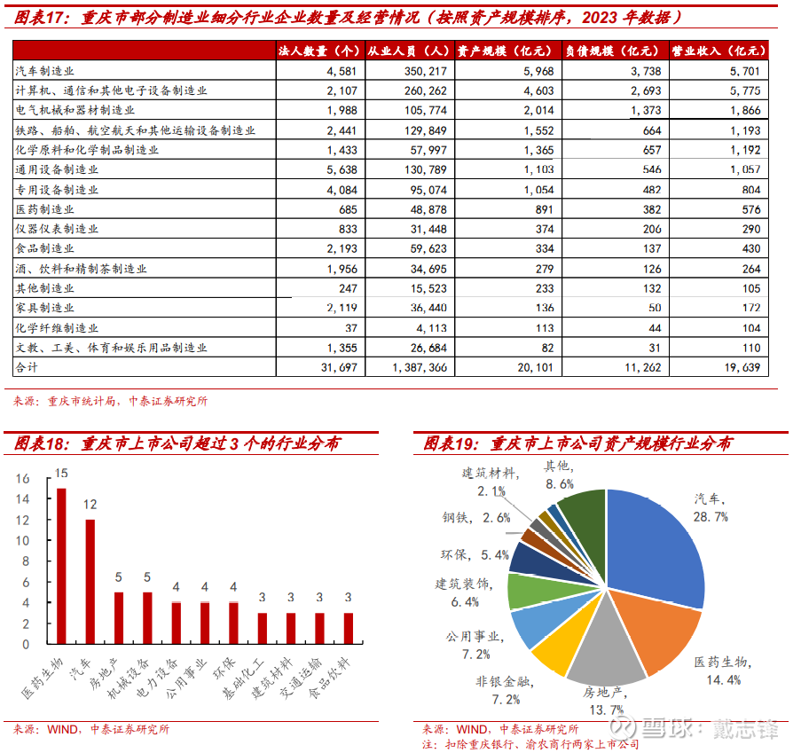 制造业品类较多,产业链丰富,汽车制造业发达。根据“33618”现代制造业集群体系,重庆市主要打造3大主导产业集群(先进材料产业、新一代电子信息制造业、智能网联新能源汽车企业)、3大支柱产业集群(软件信息服务、食品及农产品加工企业、智能装备及智能制造)、6大特色优势产业集群及18个“新星”产业集群。而从重庆当前的制造业情况来看,截至2024年共有近6.5万个制造业法人企业,根据重庆市统计局发布的《重庆市第五次全国经济普查公报(第三号)》,截至2023年重庆市汽车制造业法人数量达4581个,总资产规模近6000亿元,在各制造业细分行业中排在首位,其次计算机、通信和其他电子设备制造业,电气机械和器材制造业分别有2107家、1988家,资产规模分别为4603亿元、2014亿元。
