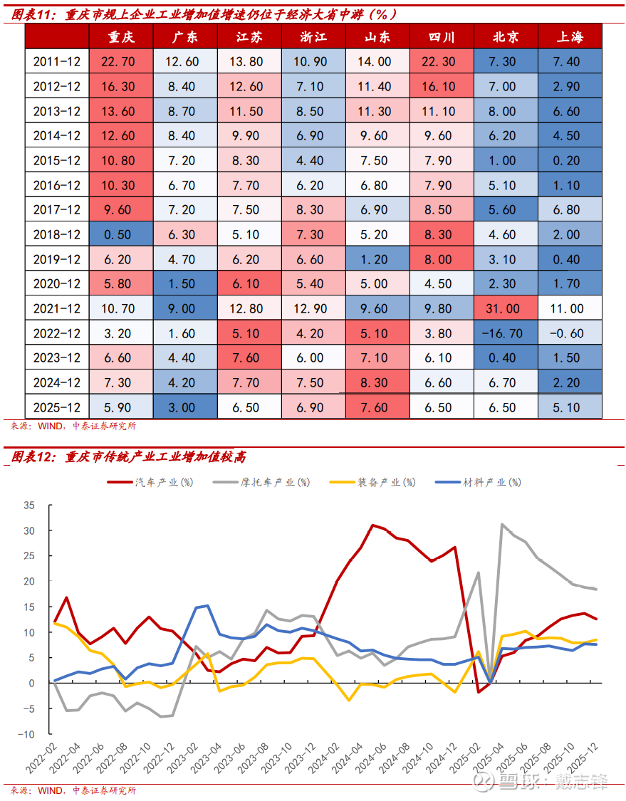 传统产业:重庆市规上企业工业增加值增速虽有下滑,但绝对值仍位于经济大省中游水平,截至2025年12月为5.9%,其中传统产业增速较高,如汽车、摩托车产业,增速仍超过10%,装备、材料行业增速分别为8.5%、7.6%,传统产业仍有明显优势。