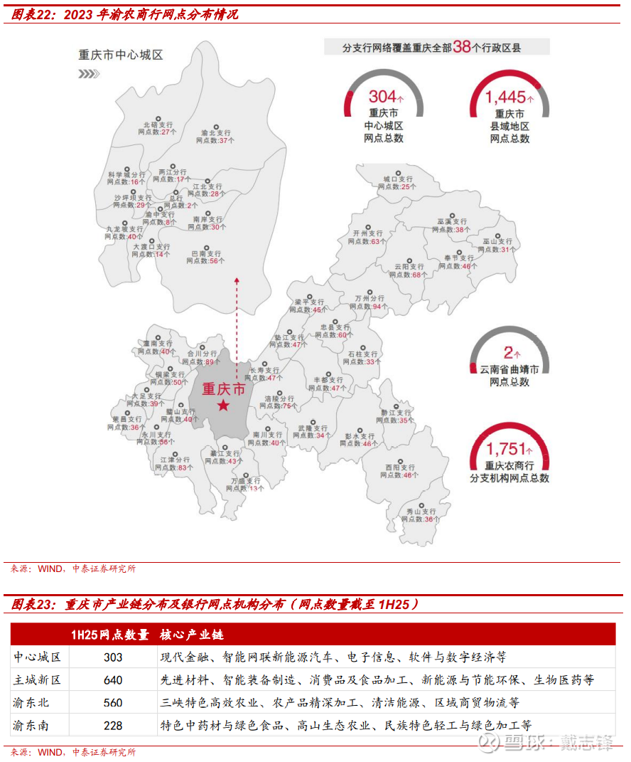 产业链动:“地缘优势”+“下沉网点”助推“产业链动”落地。1)“产业链动”一方面是“营销逻辑”,通过产业链上下游发掘潜在客户并开展客户营销,另一方面又是“风控逻辑”,通过产业链获客形成风控预警机制,提升资产质量。战略的落地可提高银行获客效率,促进存贷与中收的增长,亦能强化风控能力。2)区域β:地处重庆,“基建+产业”两开花,金融需求旺盛,产业链丰富。2024年重庆市第二产业GDP占比为36.3%,其中工业、建筑业占比分别为27.7%、8.7%,在各行业中分别排名第一、第三。A、基建:3Q25重庆市基建投资完成额反超全国平均水平,同时全年总投资额、储备项目均创新高,在战略、政策的清晰规划下,未来仍有增长空间。B、产业:传统产业如汽车、摩托车增速仍较高,同时围绕“33618”体系对未来产业规划明确,潜力较大。C、金融需求:信贷增速在经济大省中仅次于江苏与四川,企业信贷占比大、增速高,基建、产业优势下未来增长确定性较强。D、产业链:制造业品类较多,汽车产业发达,产业链丰富,“产业链动”战略落地奠定外部环境基础。3)银行α:网点数量众多且下沉,基本覆盖重庆所有县域。A、截至最新,渝农商行在重庆市共有1724个分支机构,基本覆盖重庆市38个行政区县,显著多于其他银行。同时坚守“服务县域经济”的战略定位,县域地区分支机构占比稳定高于82%。而在主城区的分支机构数量同样多于其他银行,竞争优势不弱。B、截至2025年末,重庆市县域地区制造业企业占比达57.4%,也包含部分规模较大的公司,因此分布更广、更下沉的网点分布有助于渝农商行触达更多的县域地区的制造业企业,助力推动“产业链动”落地。