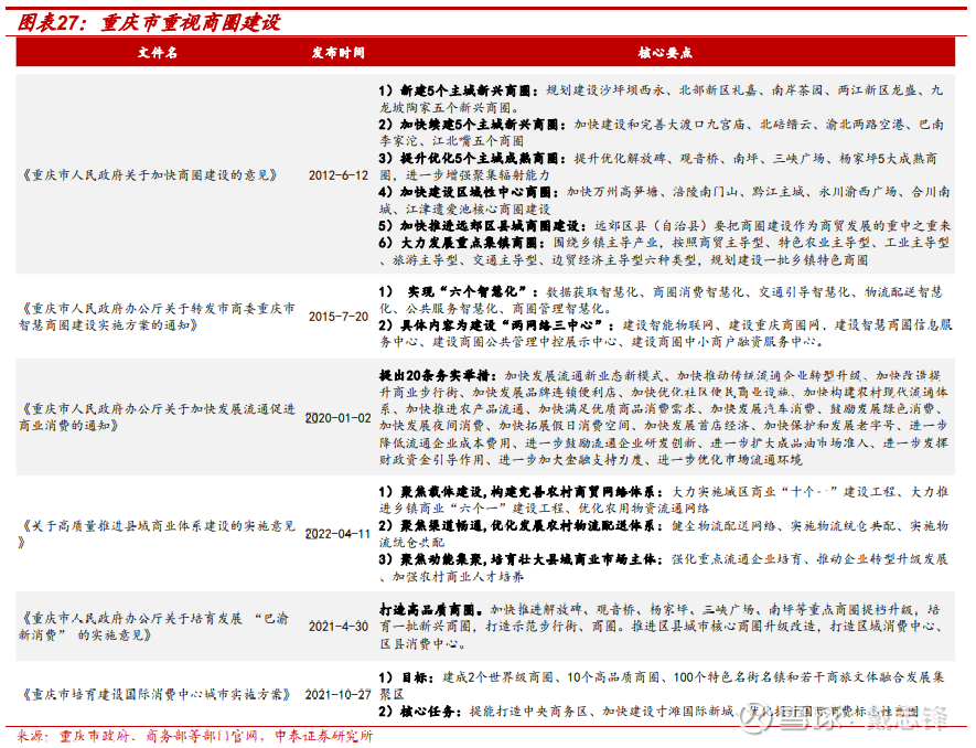 政策:重庆市重视商圈建设发展。早在2012年,重庆市政府便发布《重庆市人民政府关于加快商圈建设的意见》,提出建设5个主城新兴商圈、续建5个主城新兴商圈、提升优化5个主城成熟商圈同时加快区域性、远郊区商圈建设。后续《重庆市智慧商圈建设实施方案的通知》、《加快发展流通促进商业消费的通知》、《关于高质量推进县域商业体系建设的实施意见》、《培育发展 “巴渝新消费” 的实施意见》等文件的出台也明确了中心城区、县域地区商圈建设的目标、具体任务及未来转型方案。2021年10月,重庆市政府再次发布《重庆市培育建设国际消费中心城市实施方案》,提出要建成2个世界级商圈、10个高品质商圈、100个特色名街名镇和若干商旅文体融合发展集聚区。同时,在该文件中,除明确了中央商务区(长嘉汇大景区)、寸滩国际新城两个国际消费中心城市核心承载区外,还明确规划了包括观音桥商圈、三峡广场商圈等19个中心城区商圈,高笋塘商圈、黔江新城商圈等6个县域地区商圈共计25个商圈的建设规划,体现出重庆市政府对当地商圈建设的重视。