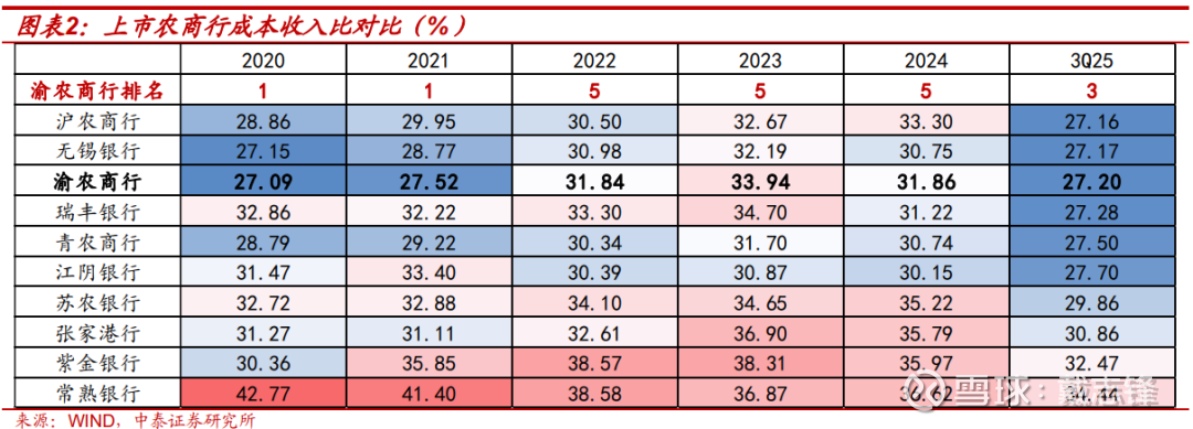 依托科技赋能业务,银行成本收入比回归下行区间,位于可比同业较优水平。2023年后,银行成本收入比逐年下行,3Q25为27.2%,较去年全年下降4.66个百分点,恢复到2020年以来的较优水平,位于上市农商行第3名,未来随着科技赋能的全面深化,仍有优化空间。
