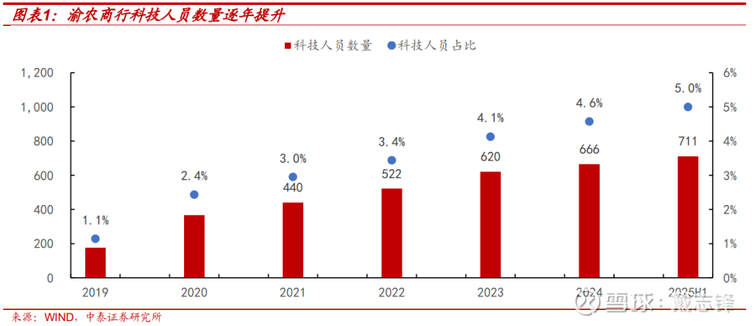 科研人员数量及占比持续提升。渝农商行拥有较强的科技团队与科技实力,同时在农商行同业中也处于领先地位。截至1H25银行及重庆渝银金融科技公司中科技人才占比达5%,环比年初提升0.4个百分点,约为711人左右,占比较之2019年提升3.9个百分点,彰显银行对科研创新的看重。