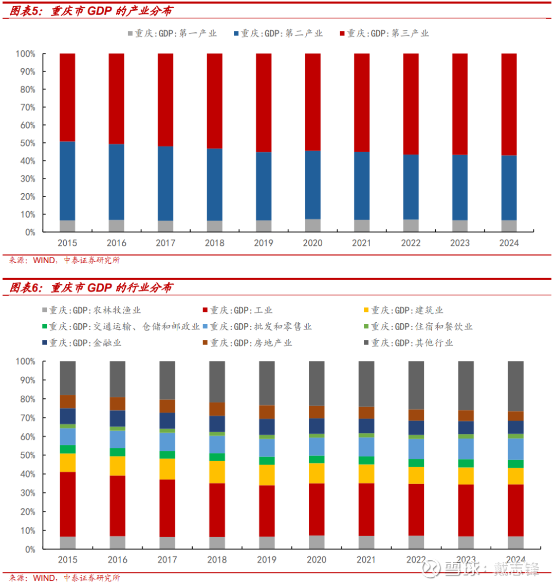 工业GDP占比虽下滑,但仍是支撑重庆市GDP的重要部分。截至2024年,重庆市第一产业、第二产业、第三产业占比分别为6.6%、36.3%、57.1%,其中第三产业占比仍有扩大趋势。从行业分布来看,2024年占比最大的三个行业分别为工业(27.7%)、批发和零售业(11.4%)、建筑业(8.7%),因此,基建和产业对重庆市经济增长贡献较大。