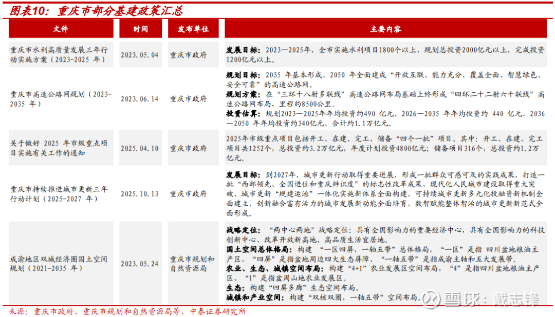 从后续发展动能来看,重庆市政府出台多项未来规划文件,支撑能力较强:1)交通:2023年6月重庆市政府出台《重庆市高速公路网规划(2023-2025年)》,预计未来近30年内将建设高速公路总里程数达8500公里,预计2026年-2035年年均投资额为440亿元。2)水利:2023年5月重庆市政府出台《重庆市水利高质量发展三年行动方案(2023-2025年)》,三年年均投资额为400亿元,未来在雅鲁藏布江下游水电工程及省内其他水利工程推动下,预计未来仍能为当地贡献400亿元左右的投资额。3)城建:2025年10月,重庆市政府出台《重庆市持续推进城市更新三年行动计划(2025-2027 年)》,为未来三年城市更新作为项目发展目标及相关举措。4)双城经济圈建设:《成渝地区双城经济圈国土空间规划(2021-2035 年)》为重庆市与成都市双城发展做出明确指示,从战略定位、空间格局、核心任务等多个方面明确未来的发展规划,其中涉及多项基建相关战略项目,未来融资需求、战略支撑能力较强。