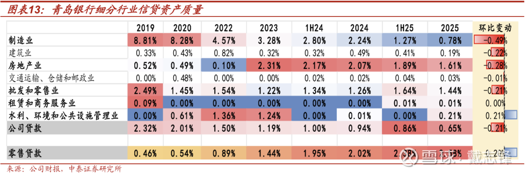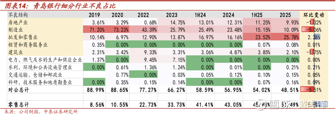 细分行业不良率:对公持续改善,零售不良率有所上升。截至2025年,行业不良率来看:(1)对公:不良率延续下降趋势,较年初下降29bp至0.65%,其中制造业不良率较年初大幅下降146bp。(2)零售:不良率较年初提升55bp至2.58%。
