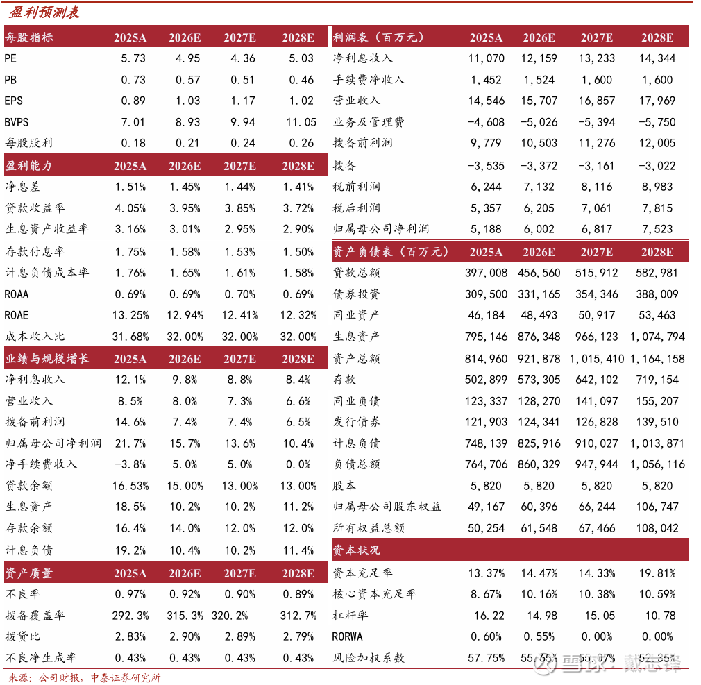 投资建议:公司2026E、2027E、2028E PB 0.57X / 0.51X / 0.46X;PE 4.95X / 4.36X / 5.03X。青岛银行扎根青岛、依托山东经济三大动能,结合自身市场化机制,打造绿色、蓝色金融特色,信贷、业绩有望维持较优增长。维持“增持”评级。