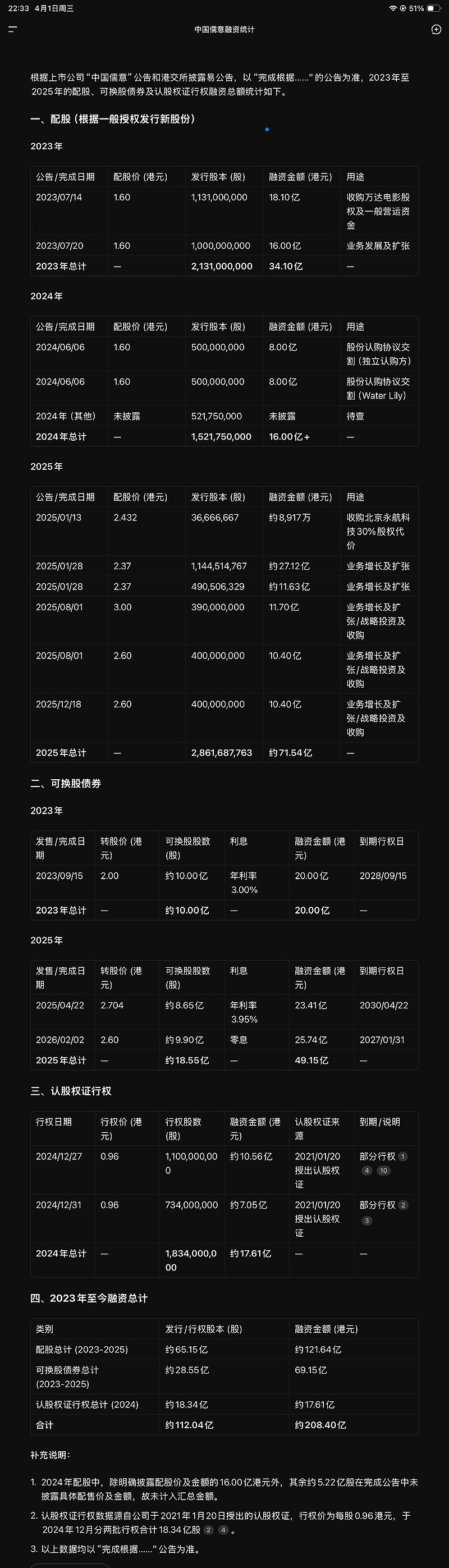 $中国儒意(00136)$ 有点仓才上心,从2023FY至今的融资情况看(数据未核,供参考),对柯生的筹款能力表示敬仰,这何止是金鸡。看了「综合财务状况表」,收/并购的资产光商誉就有44亿,明年起后续年年有20亿+CB到期,但配股部分不用还的巨额融资算摊薄还是增厚了老股东权益?这种急速扩张模式真是大棋局,风险与机遇共存,太考全盘的统筹管理和经营力了,成则大胜败也一线悬。过了缄默期,只要再次融资或到止损线必斩仓。