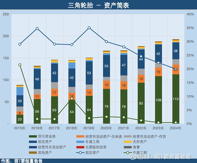 经营结果从资产结构来看,一目了然:三角疯狂积累现金,2024 年末现金类占总资产 60%。应收存货五年间纹丝不动。固定资产、在建工程五年间只有消耗没有新增。赛轮则是固定资产、在建工程、应收存货都大幅同增。