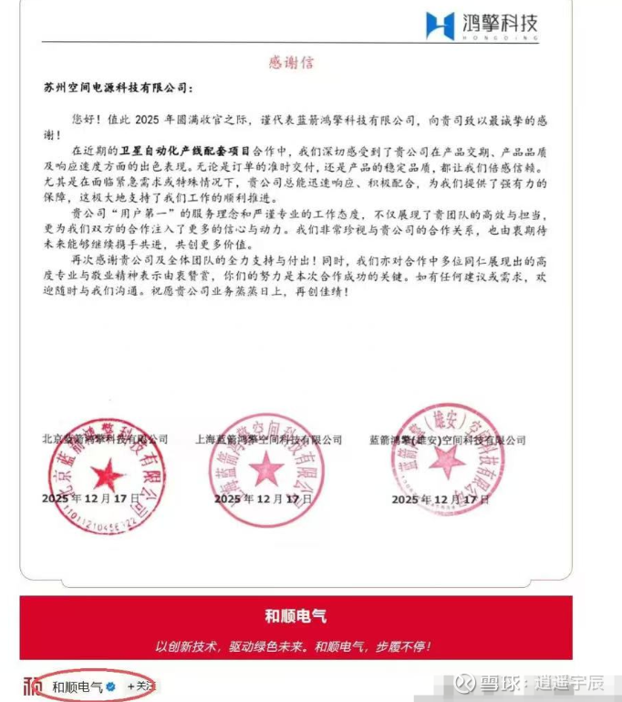 2025年12月26日回复称,苏州空间电源科技有限公司为公司参股子公司,主营业务为商业卫星电源产品。 蓝箭鸿擎科技有限公司是卫星组网解决方案商。