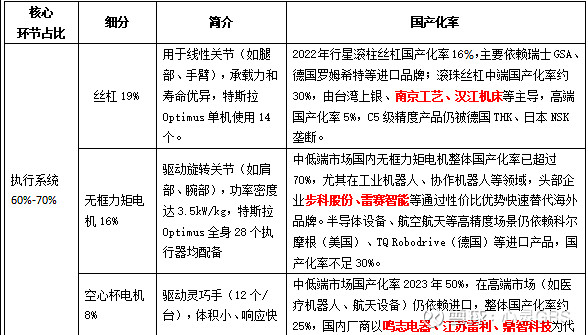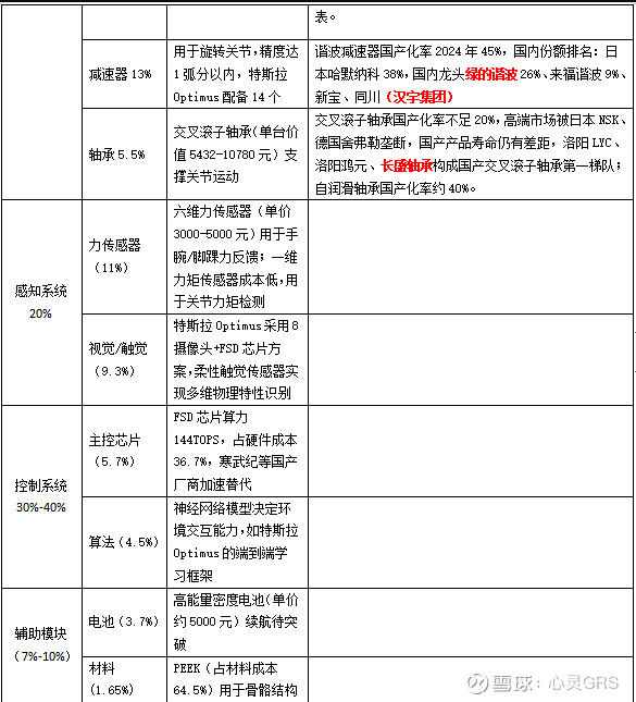 $五洲新春(SH603667)$ $三花智控(SZ002050)$ $南京化纤(SH600889)$ 根据《2024人形机器人产业链白书》及特斯拉Optimus Gen2、小米CyberOne等产品数据,核心零部件价值量占比及国产化率如下: