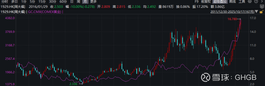 复盘周大福和金价的走势,不难发现两者存在强相关关系,而且金价启动往往领先周大福股价1年。(可能和国民的买涨不买跌特性有关)