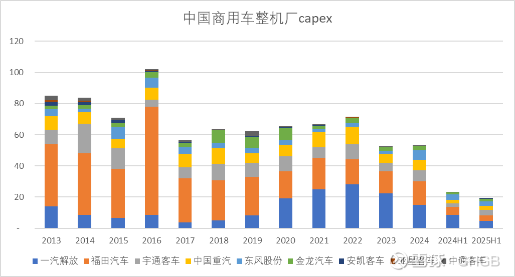 跟乘用车风驰电掣般的capex作为对比,中国的商用车更显保守。商用车的capex 维持在50亿的体量,2023-2024年甚至下一个台阶,25年继续下降。翻开宇通的股价图,很多人归因于出海的叙事,但底层的逻辑可能是供给的理性。