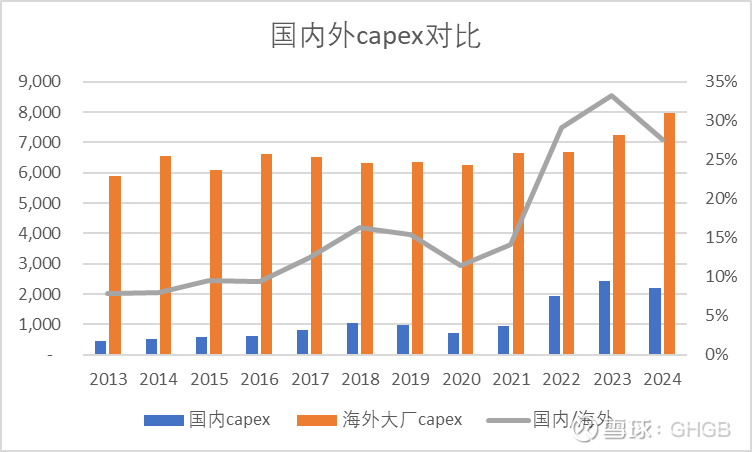 海外capex一直比较稳定,日韩德的主要品牌大厂总capex过去10年在900亿美金的水平,最近3年有所提高,2023和2024年超越千亿美金。