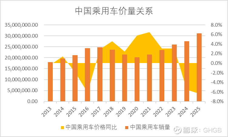 不难发现,中国乘用车量价呈现反比关系。2015-2016年,价格下跌,但销量提高。2024-2025年同理。