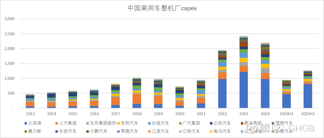 我们可以看到2022年开始连续3年,中国乘用车整机capex达到每年2000亿以上的体量,三年累计投入近7000亿,2025年同比继续提高34%。这还没考虑粗粮和未上市公司等新进入者。