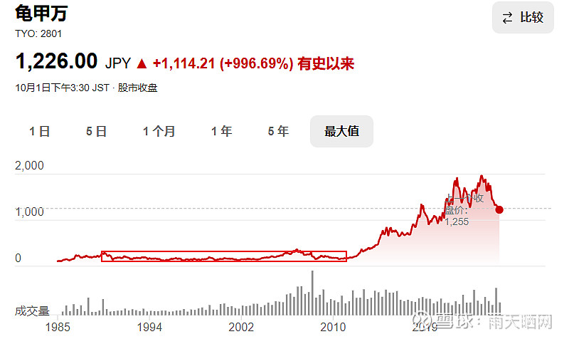 很多人说酱油是个好赛道,那么来看看邻居日本的酱油龙头龟甲万的股价走势。龟甲万在1990年房地产泡沫破裂之后,陷入10年滞涨,从1990年,一直横盘至2003年,13年未涨,而即使在已经走通国际化之后,拥有了了第二增长曲线的情况下,也并未扭转颓势股价的颓势。直到2003-2008年日本股市的牛市,龟甲万的股价才收复失地,再创新高。但很快金融危机爆发,又再次跌回原点,进入又一轮横盘震荡。一直到2012年,龟甲万才依靠在海外高端酱油品牌走量,加上日元大幅贬值导致兑汇收入大幅提升后,走出一轮长牛。虽然说中国的酱油行业集中度还有提升空间,然而老龄化对于消费品,是一个更长期的负面影响。未来数十年,酱油茅恐怕都将受老龄化影响。海天味业未来一段时期内的总体定位大概率还是偏向于红利股,成长性大概率不会太好了。如果看股息率的话,目前的股息率比起公用事业公司,并没有太大吸引力。未来的看点,还是看并购带来的横向增量,以及出海方面的进展,没有5-10年的时间,恐怕是不太容易见到明显效果。