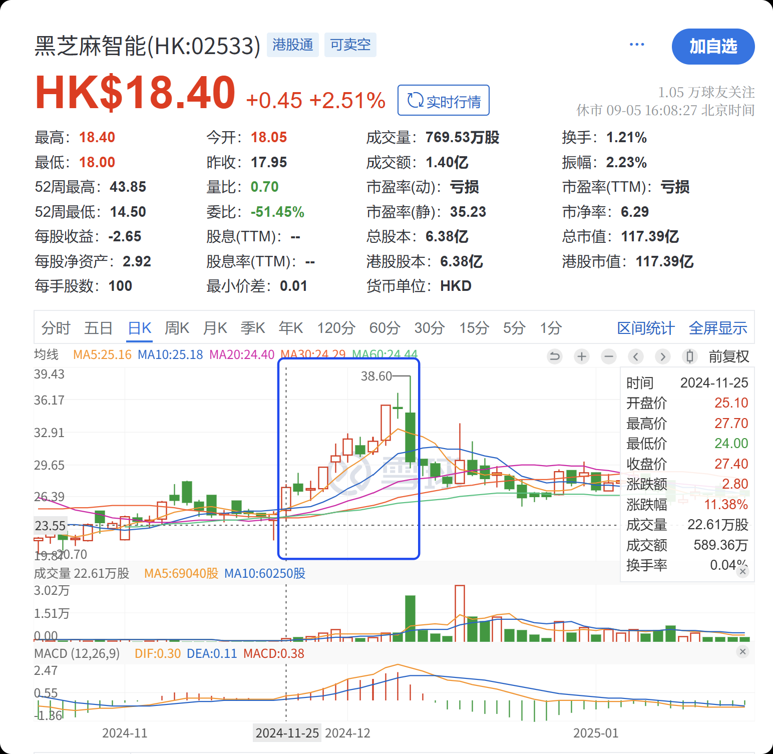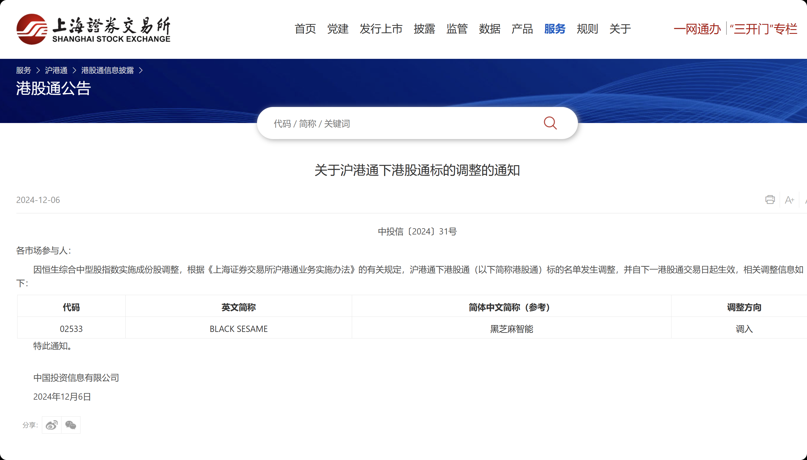 黑芝麻智能(2024年8月上市),2024年9月30日触发季度调整,2024年11月22日恒指公司宣布纳入恒生综合指数,2024年12月6日被宣布纳入港股通。