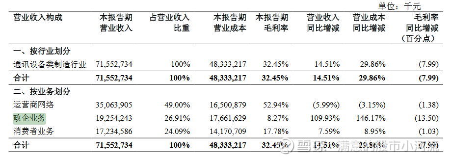 按业务分了三大部分:运营商网络,政企业务和消费者业务。运营商网络是他的核心业务也是最赚钱的业务,占收入比重49%,毛利率52.94%,但这块业务同比还是在萎缩的,同比降低了5.99%。第二大业务是政企业务,占收入比重26.91%,这块业务增长迅猛,同比翻了一番,然而这块业务是最不赚钱的,毛利率只有8.27%,同比降低了13.5%。消费者业务营收增长7.59%,但毛利率也不高只有17.78%,毛利率同比也是降低的。政企业务毛利率的大幅降低也就造成了增收不增利的局面。