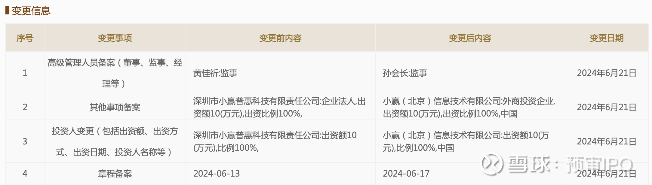 瑞财经 徐迪 6月25日,国家企业信用信息公示系统显示,深圳市依镧企业管理咨询有限公司(“深圳依镧”)投资人由“深圳市小赢普惠科技有限责任公司”(“小赢普惠”)变更为由“小赢(北京)信息技术有限公司”(“小赢北京”)100%持股;同时,监事由孙会长变更为黄佳祈。