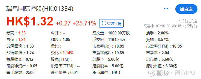 瑞财经 王敏7月10日,瑞昌国际控股(HK:01334)在港交所挂牌上市,第一上海为其独家保荐人,开盘涨25.71%,总市值6.60亿港元。