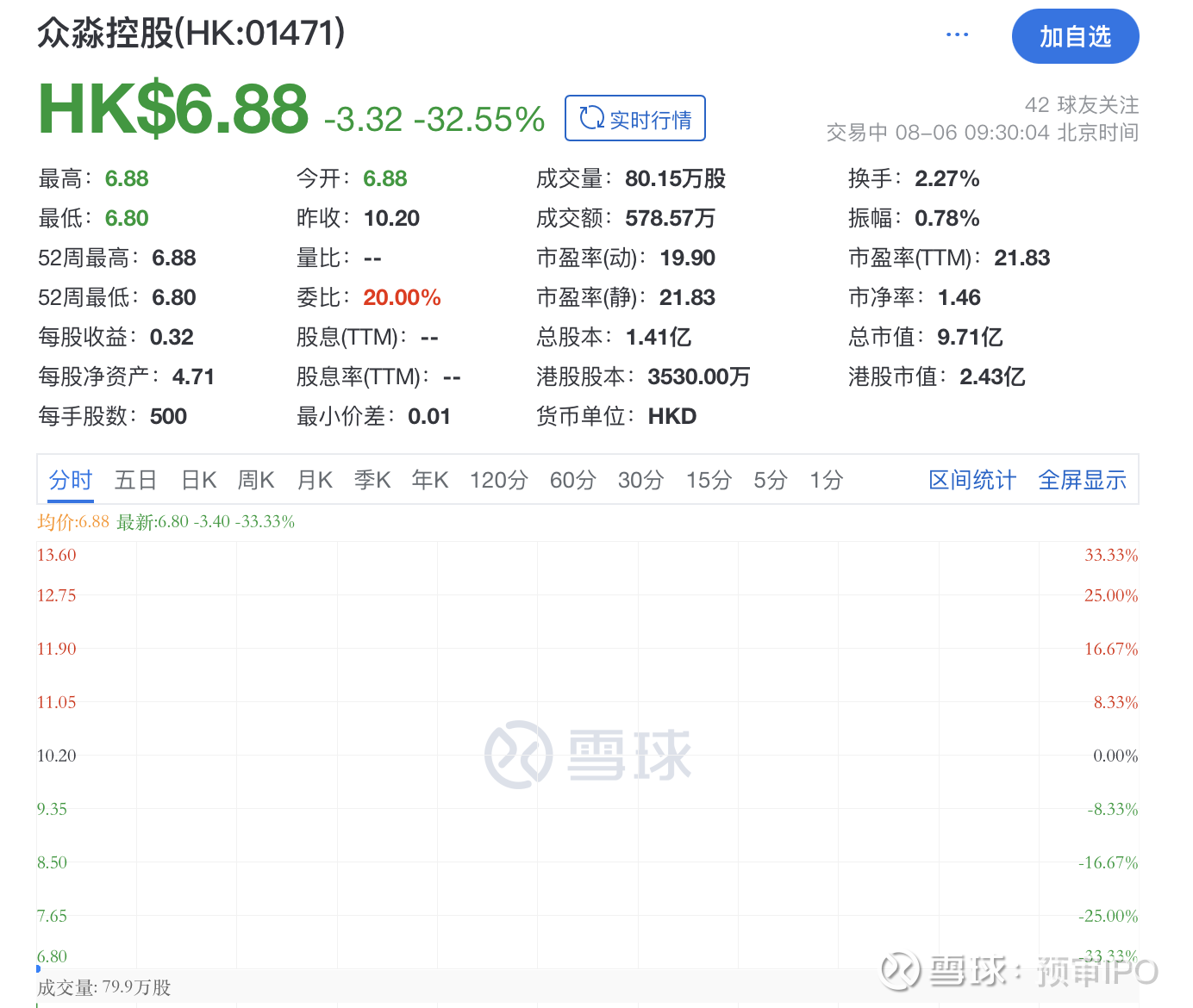 瑞财经 吴文婷 8月6日,众淼控股登陆港交所,其开盘报6.88港元,跌32.55%,总市值约9.71亿港元,中信证券及中国平安资本(香港)担任联席保荐人。