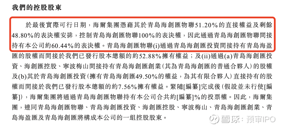 于最后实际可行日期,海尔集团凭借其于青岛海创汇物联51.20%的直接权益及剩余48.80%的表决权安排,控制青岛海创汇物联100%的表决权,因此通过青岛海创汇物联间接持有公司约60.44%的表决权。