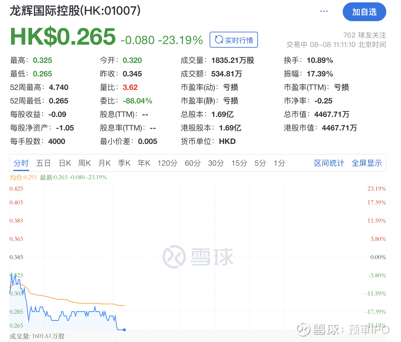瑞财经 吴文婷 8月8日,截至发稿时,龙辉国际控股报0.265港元,跌23.19%,总市值约4467.71万港元。