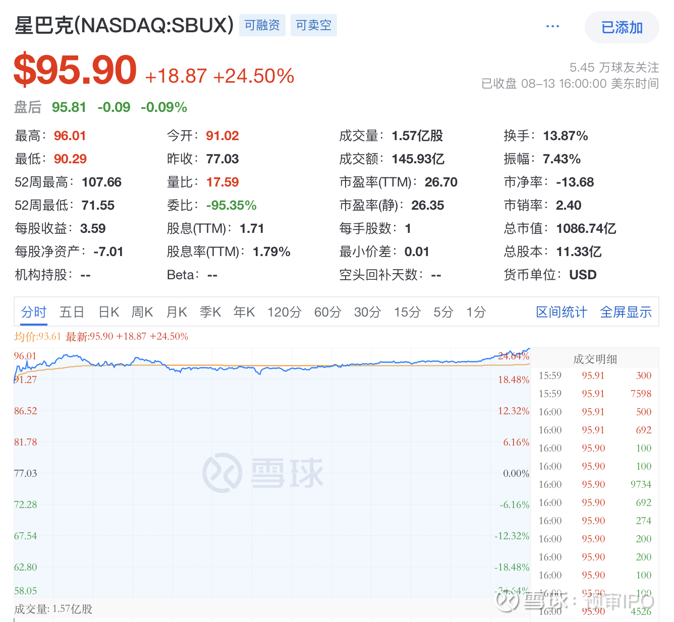 受此消息影响,星巴克股价大涨。截至当地时间8月13日收盘,其报95.9美元,涨24.5%,总市值约1086.74亿美元。