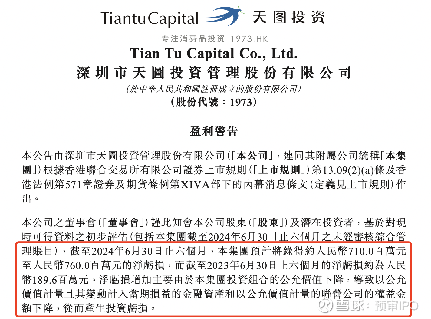 瑞财经 吴文婷 近日,天图投资发布盈利警告,截至2024年6月30日止六个月,集团预计将录得约7.1亿元至7.6亿元的净亏损,而截至2023年6月30日止六个月的净亏损约为1.9亿元。