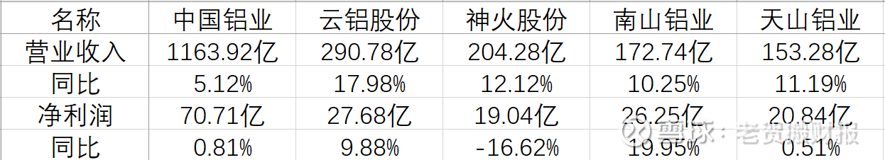 中国铝业,营业收入 1163.92 亿,同比增长 5.12%;净利润 70.71 亿,同比增长 0.81%。