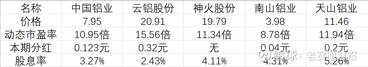 中国铝业价格为 7.95 元,动态市盈率为 10.95 倍;本期分红 10 股派 1.23 元,股息率为 3.27%。