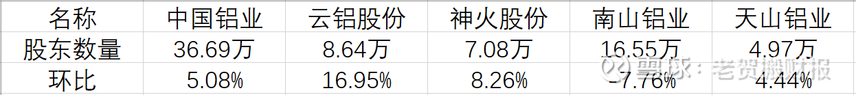 中国铝业的股东数量为 36.69 万,环比增加 5.08%;