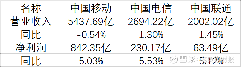 中国移动,营业收入 5437.69 亿,同比下降 0.54%;净利润 842.35 亿,同比增长 5.03%。