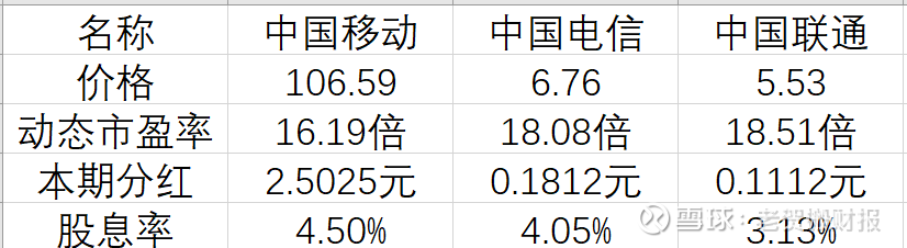 中国电信价格为 6.76 元,动态市盈率为 18.08 倍;本期分红 10 股派 1.812 元,股息率为 4.05%。