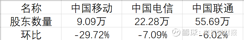 中国移动的A股股东数量为 9.09 万户,环比减少 29.72%(移动大部分股份在港股);