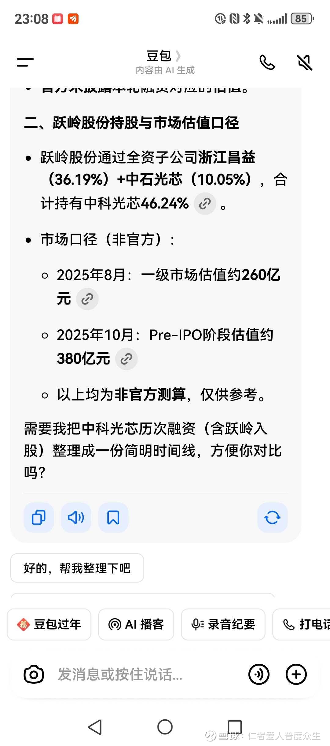 跃岭股份为何突然涨停?核心公司持有中科光芯10.88%股权,目前一级市场估值380亿,二级市场估值至少千亿。在光模块行情火爆情况下,公司拟挂牌转让该股权,可能遭遇疯抢。但仔细一想,该权益价值百亿,有几家公司能能拿得出如此规模资金,况且上市不确定性因素太多,竞拍者还是有风险的。但如果出价太低,公司又不愿意出让,该股权转让成功率极低。在目前光模块火爆背景下,只要板块继续高歌猛进,不管转让与否,跃岭股份都会水涨船高,因为价值就在那里。如果转让成功,快速变现至少几十亿,随便都可以收购现在热门资产。如果转让失败,想象空间巨大,借壳上市,跃岭股份市值千亿都有可能。$跃岭股份(SZ002725)$查看图片