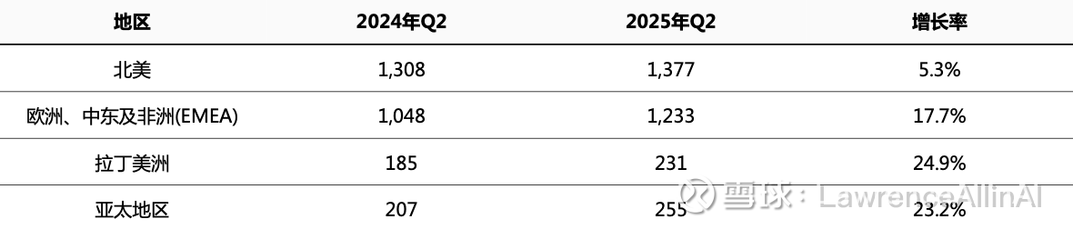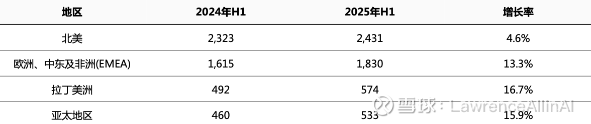 3.北美稳健但增速放缓:北美仍是最大收入来源(2025年Q2占比44.5%),但季度/半年增速均低于其他地区(Q2:5.3%,H1:4.6%)。